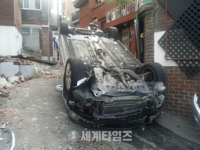 [세계타임즈 이채봉 기자]용산구 원효로41가길 38 그린세탁소 근처 골목길 승용차 사고 주택 2채가 파손 되었다