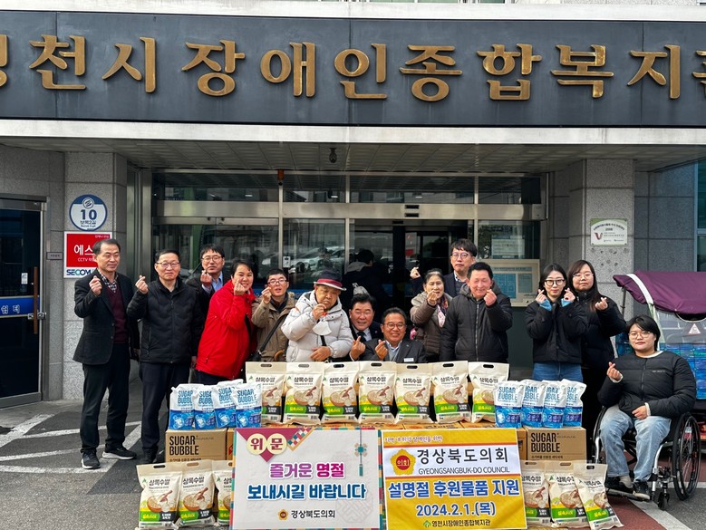 [경북 세계타임즈=한윤석 기자] 경상북도의회 윤승오(영천2, 교육위원장)·이춘우(영천1, 기획경제위원장) 도의원이 2024년 갑진년 설날을 맞이하여 2월 1일(목) 영천시에 소재한 마야정신요양원, 장애인종합복지관, 종합사회복지관을 방문해 값진 이웃사랑을 몸소 실천했다.