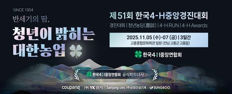 이번 대회는 한국4-H중앙연합회(회장 류진호) 주관으로 ‘반세기의 땀, 청년이 밝히는 대한농업’을 슬로건으로 전국 청년4-H회원과 지도자 등 1,200여 명이 한자리에 모여 청년 농업인의 기술력과 도전정신을 공유하는 전국 규모 행사로 열린다.