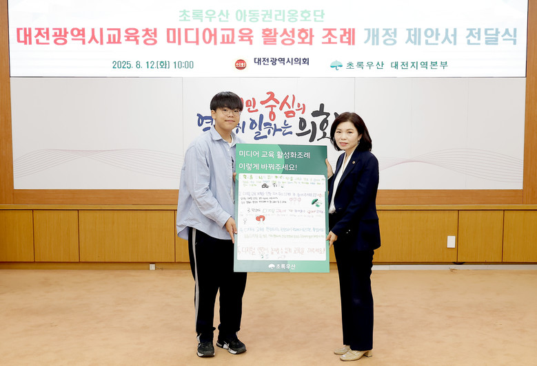 [대전 세계타임즈=이채봉 기자] 대전광역시의회 이금선 의원(교육위원장, 국민의힘, 유성구4)은 12일, 시의회에서 초록우산 대전지역본부 아동권리옹호단으로부터 「대전광역시교육청 미디어교육 활성화 조례」개정 제안서를 전달받았다.