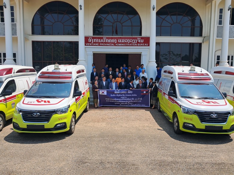 경남도의회(의장 김진부)가 25일, 우호교류 협약단체인 라오스 비엔티엔주의회에 소방 특수구급차량 10대와 특수방화복 60착 등 소방용품을 기증하고 기증식을 개최했다. 2대는 인근 바께오주에 전달됐다.