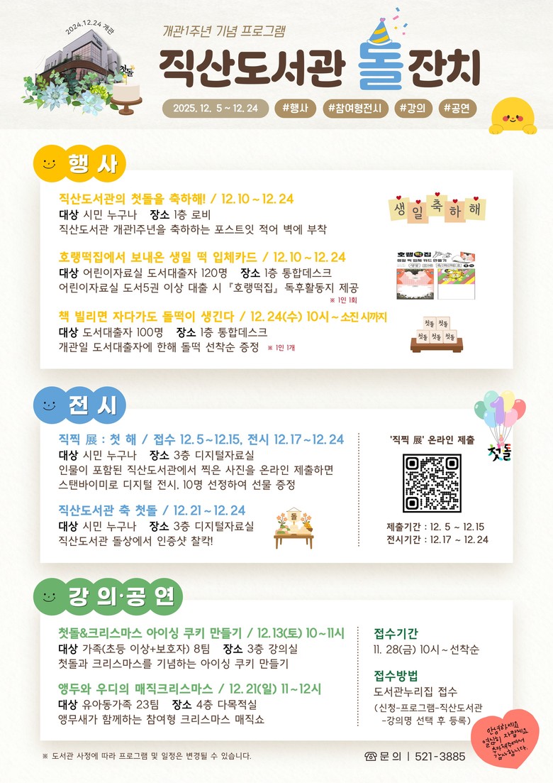 직산도서관 돌잔치에서는 ▲개관 1주년 축하 메시지 ‘첫돌을 축하해’ ▲책 빌리면 자다가도 돌떡이 생긴다 ▲직찍 전(展) : 첫 해 ▲첫돌&크리스마스 아이싱 쿠키 만들기 ▲앵두와 우디의 매직 크리스마스 공연 등이 진행될 예정이다.