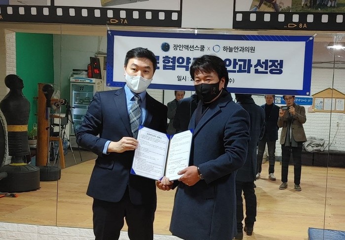 [세계타임즈 백진욱 기자] 지난 19일 장인 액션스쿨이 하늘안과의원과 의료 서비스 지원 협약을 체결했다.