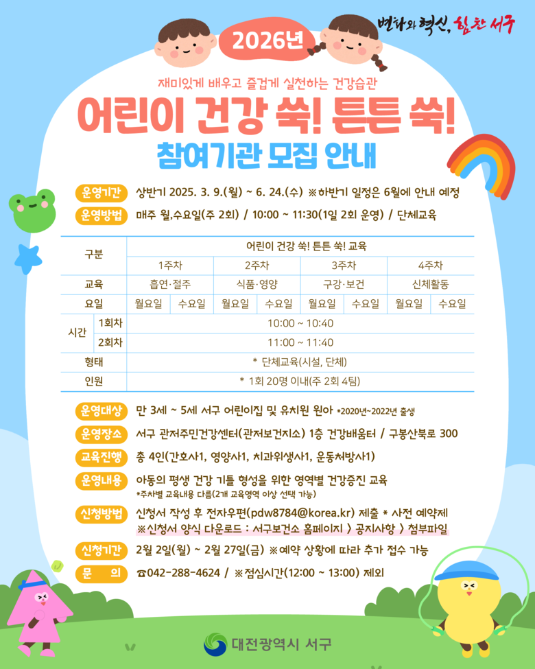 구 관계자는 “어린이들이 자연스럽게 건강한 생활습관을 익힐 수 있도록 프로그램을 마련했다”며 “앞으로도 아동 건강증진을 위한 교육을 지속적으로 추진하겠다”고 말했다.