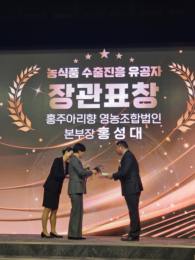 장관표창을 수상한 홍주아리향 영농조합법인 홍성대 본부장은 “이번 수상은 생산 농가와 관계자 모두가 함께 이뤄낸 값진 성과”라며, “앞으로도 홍주아리향의 우수한 품질을 바탕으로 수출 확대와 지역 농업 발전에 더욱 힘쓰겠다”고 소감을 밝혔다.