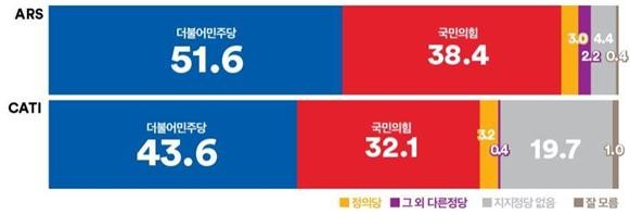 ARS 조사 결과에서 더불어민주당은 지지율 상승세가 멈추고 2주 전 지지율 수준인 51.6%로 돌아갔다. 국민의힘은 3주째 보인 하락세가 반등하며 지난주 대비 2%p 상승한 38.4%를 기록하였다. 주로 인천·경기, 대전·세종·충청 지역에서 지지율 반등이 큰 폭으로 나타났다. 연령별로는 30대와 50대에서 지난주 대비 큰 폭의 지지율 상승이 나타났다. 특히 매주 지지율 등락을 거듭한 30대에서 지난주와 달리 국민의힘 지지율이 8.8%p 오르며 32.9%를 기록하였다. 중도층에서도 지난 주 대비 7.3%p 오르며, 국민의힘 지지율을 36.3%까지 회복되었다. 그러나 국민의힘 콘크리트 지지율을 보여왔던 대구·경북 지역에서 더불어민주당 지지율 급등, 국민의힘 지지율이 급락하며 49.1%의 더불어민주당이 44.4% 지지율에 머문 국민의힘을 역전하는 이변이 나타났다.