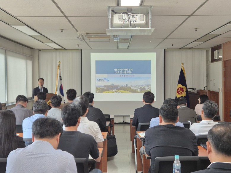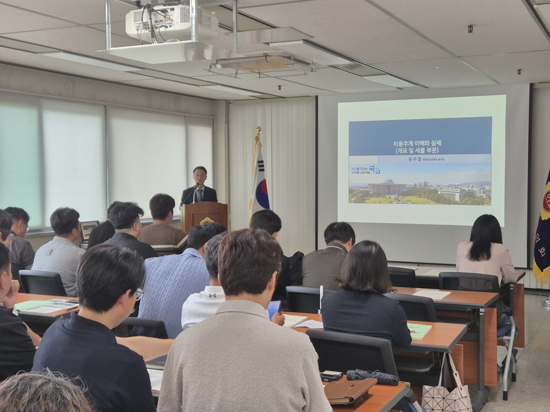 이날 교육은 국회예산정책처 백경엽 세제분석2과장, 윤주철 추계세제분석관을 초청해 세입·세출별 비용추계 기법과 주요 사례 등을 공유했다.