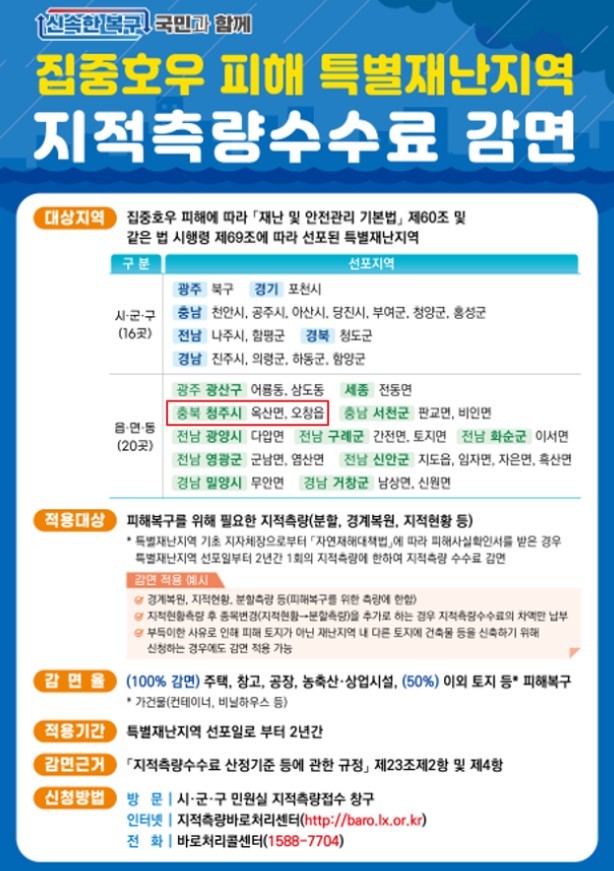 지적측량 수수료 감면 조치는 집중 호우로 주거용 건물이 전파 또는 유실되는 등의 피해를 입은 주민이 주택 신축이나 복구 등을 위해 소요되는 지적측량수수료를 감면해 주고자 국토교통부의 승인을 받아 마련되었다.