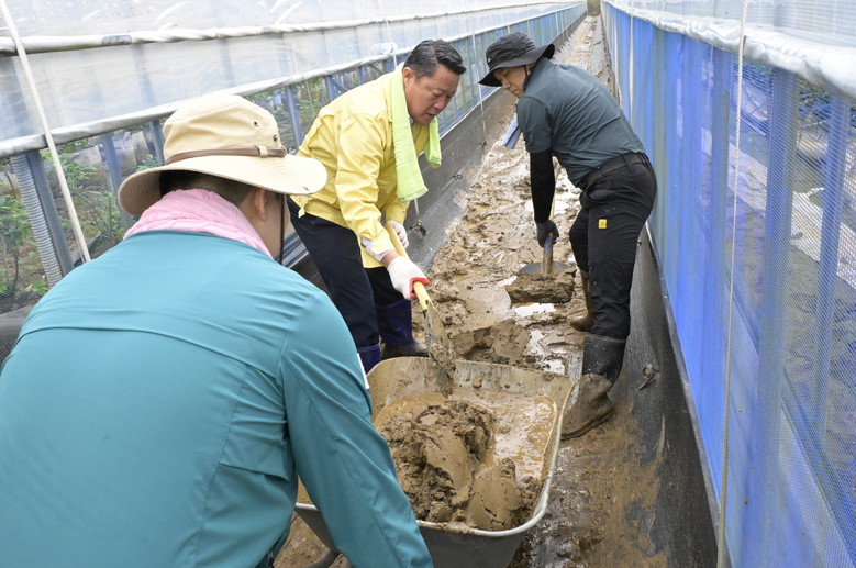 최영일 군수를 비롯한 공무원들은 피해 지역별로 분산 배치돼 ▲주택 내 가재도구 정리 ▲하우스 내부 토사 제거 ▲쓰레기 분리수거 등을 집중적으로 수행했다.