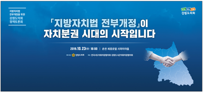 [강원도=세계타임즈 김민석 기자] 강원도의회는 “지방자치법 전부개정과 자치분권 가치 실현”이라는 주제로「지방자치법 전부개정을 위한 정책토론회」를 10.23(수) 16:00시에 세종호텔에서 개최한다.