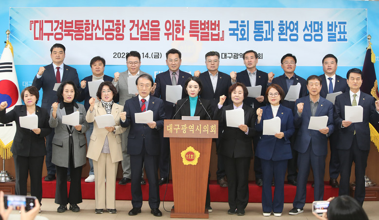 대구시의회는 성명서를 통해 “대구경북신공항은 지방 소멸의 위기를 극복하고 지역의 글로벌경쟁력을 획기적으로 개선하려는 대구·경북의 숙원사업으로, 이번 특별법의 국회 통과는 신공항 건설을 위한 지금까지의 과정 중 이전부지 선정과 군위군 대구편입과 함께 가장 진일보한 성과”라고 평가했다.