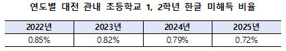 분석 결과에 따르면, 2025학년도 대전 관내 초등 1, 2학년 한글 미해득 학생 비율은 0.72%로 나타났다. 이는 2022년 0.85%, 2023년 0.82%, 2024년 0.79%에 이어 4년 연속 감소한 수치로, 대전교육청이 추진해 온 한글책임교육 정책이 실질적인 성과를 거두고 있음을 보여준다.