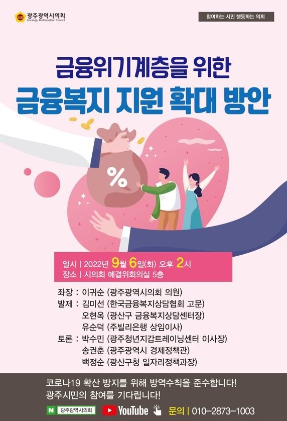 [광주 세계타임즈=손권일 기자] 광주광역시의회에서는 6일 오후2시 광주시의회 5층 예결위회의실에서「금융위기계층을 위한 금융복지 지원 확대 방안」이라는 주제로 토론회를 개최한다.