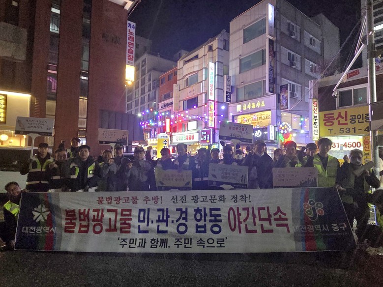 [중구 세계타임즈=이채봉 기자] 대전 중구(구청장 김제선)는 보행자의 안전을 위협하는 불법광고물을 근절하고자 지난 19일 오류동 상가 밀집 지역 일대에서 ‘불법광고물 민‧관‧경 야간특별단속’을 실시했다고 밝혔다.
