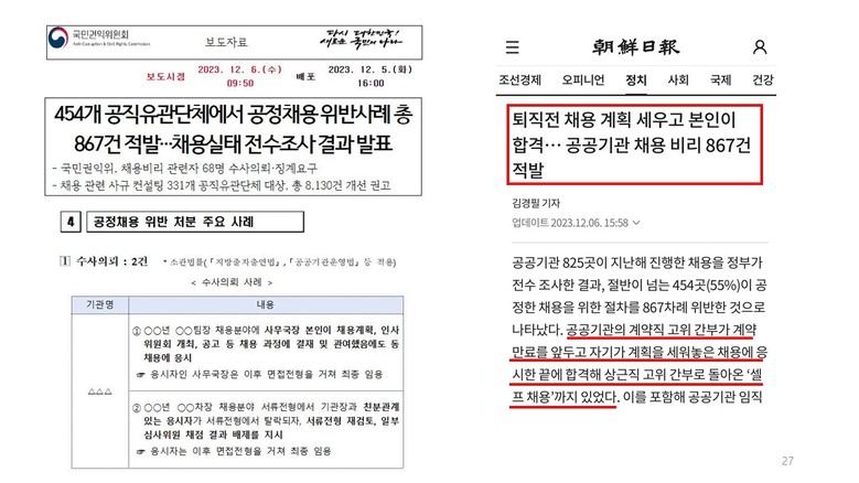 * [첨부1] 국가권익위원회, ‘454개 공직유관단체에서 공정채용 위반사례 총 867건 적발…채용실태 전수조사 결과 발표’