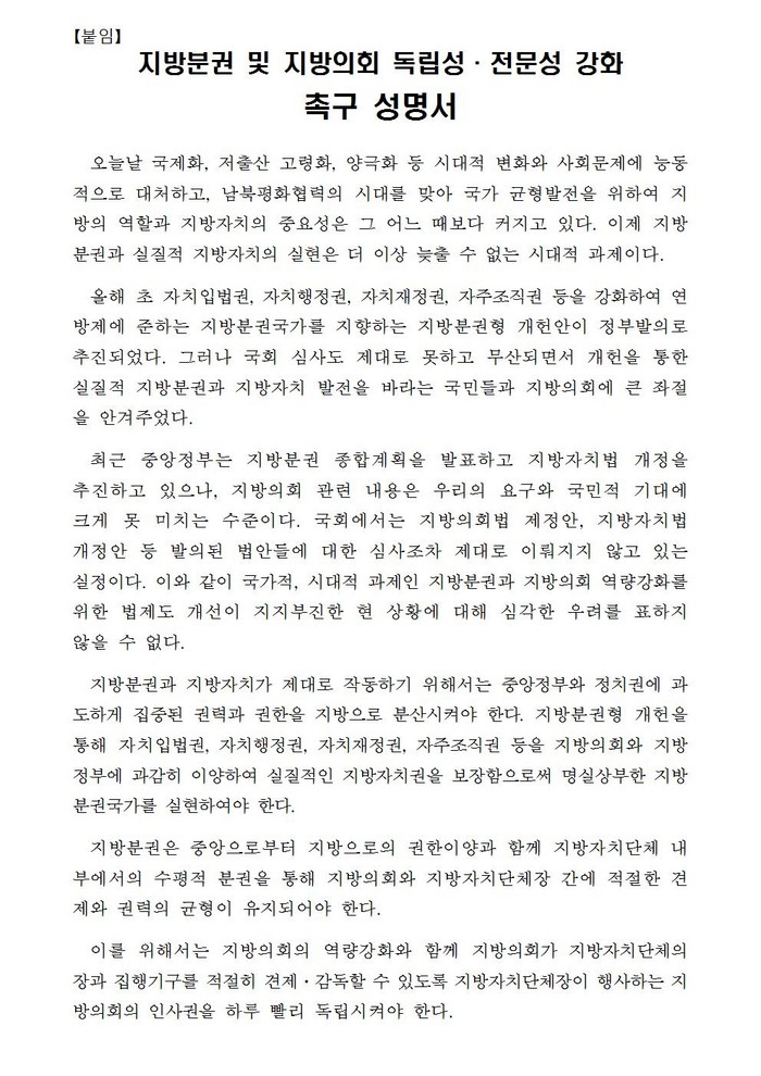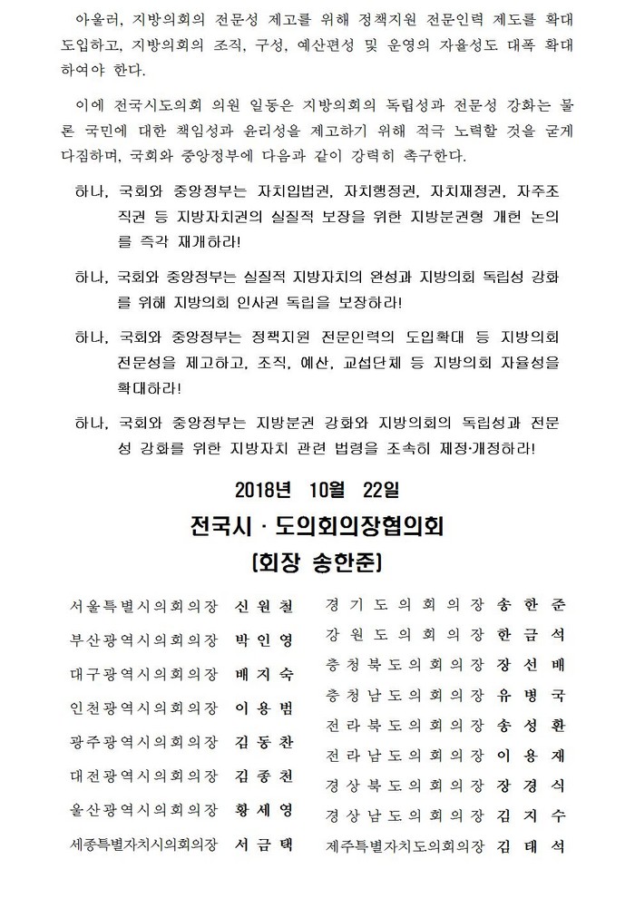 △실질적 지방자치의 완성과 지방의회 독립성 강화를 위해 지방의회 인사권 독립을 보장할 것. △ 정책지원 전문인력의 도입확대 등 지방의회 전문성을 제고하고, 조직, 예산, 교섭단체 등 지방의회 자율성을 확대할 것 △ 지방분권 강화와 지방의회의 독립성과 전문성 강화를 위한 지방자치 관련 법령을 조속히 제정.개정할 것 등을 촉구하였다.