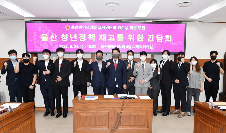 [울산 세계타임즈=이호근 기자] 울산광역시의회 교육위원회 권순용 의원과 안대룡 의원은 24일 오전 10시 울산대학교 총학생회 임원진과 울산과학대학교 총학생회 임원진을 비롯한 13명의 울산 청년들, 울산시 관계공무원 등과 함께 울산 청년정책 재고를 위한 간담회를 개최하고 현재 시행되고 있는 울산 청년정책에 대해 논의했다.