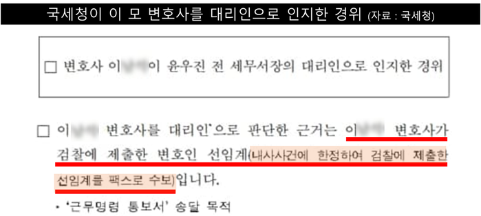 2012년 9월 윤 전 서장이 경찰 수사를 피해 해외로 도피하자 국세청은 이 모 변호사에게 윤 전 서장의 근무 복귀를 명령하는 공문을 3차례 발송한다. 정일영 의원이 국세청에게 이 모 변호사가 윤 전 서장을 대리해 공문을 수신하게 된 경위를 확인한 결과, 이 모 변호사는 검찰에 제출했던 변호인 선임계를 국세청에 대리인 자격 증빙서류로 낸 것으로 밝혀졌다.