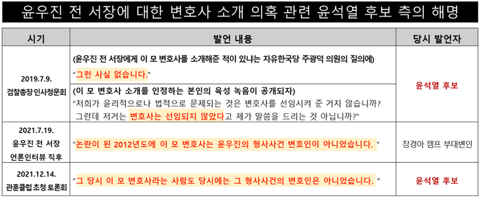 이 과정에서 당시 대검찰청에 근무하던 윤석열 후보가 검찰 전관인 이 모 변호사를 변호사법에 위반해 윤 전 세무서장에게 소개한 것이 아니냐는 논란이 일자, 윤석열 후보는 이 모 변호사가 2012년 경찰 수사 당시 윤 전 서장의 변호인으로 선임된 사실이 없다고 부인해왔다.