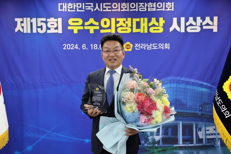 한편, 대한민국시도의회의장협의회에서 수여하는 '우수의정대상'은 모범적인 의정활동 사례를 널리 알려 지역주민의 삶의 질 향상과 지방자치 발전에 기여하고 의정활동을 격려하고자 엄격한 심사를 통해 선정되는 권위 있는 상으로, 올해로 15회째를 맞았다.