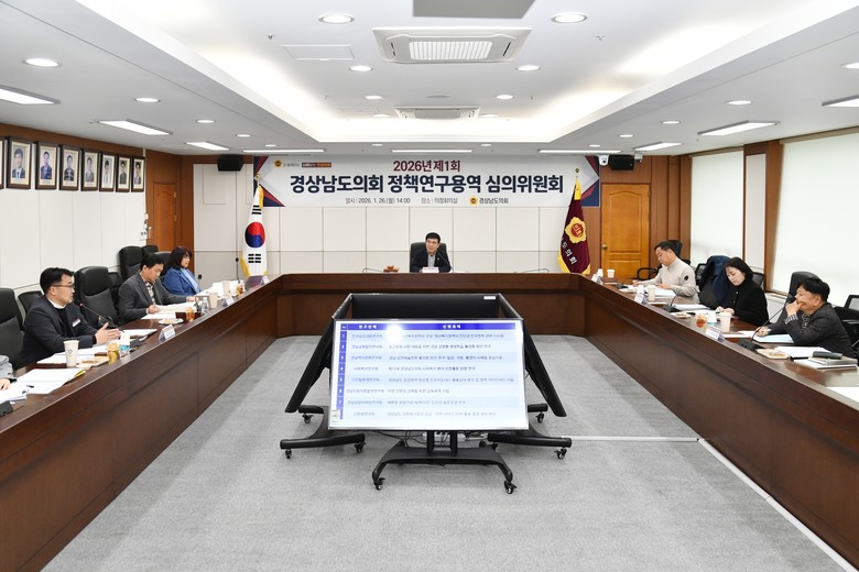 [경남 세계타임즈=최성룡 기자] 경상남도의회는 1월 26일(월), 의정회의실에서 ‘2026년 제1회 정책연구용역 심의위원회(위원장 서민호)’를 개최하고, 올해 상반기 추진될 8개 과제를 최종적으로 확정하며 민생 중심의 정책연구 활동에 본격적으로 나섰다.