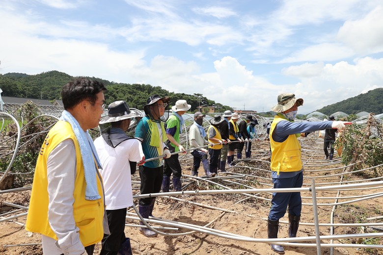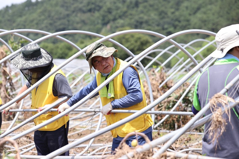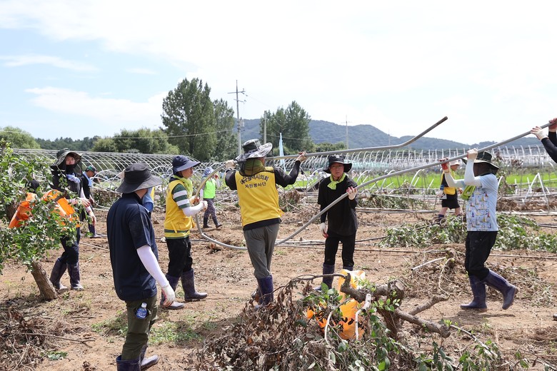 이날 대구시의회 봉사단은 수해 지역 대추나무 농가를 찾아 폭우로 파손된 비닐하우스의 비닐, 철골을 철거하고, 농작물과 토사 등 이물질을 제거하는 등 피해복구에 모자란 일손을 더하고 땀을 흘렸다.