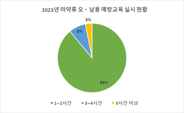 실제로 부산교육청이 제출한 자료에 의하면, 2023년 부산 전체 학교(635개) 중 563개(89%) 가 1년에 1~2시간 교육을 시행한 것으로 나타나 학생들의 마약류 오ㆍ남용을 예방하기에 턱없이 부족한 실정이다.1)