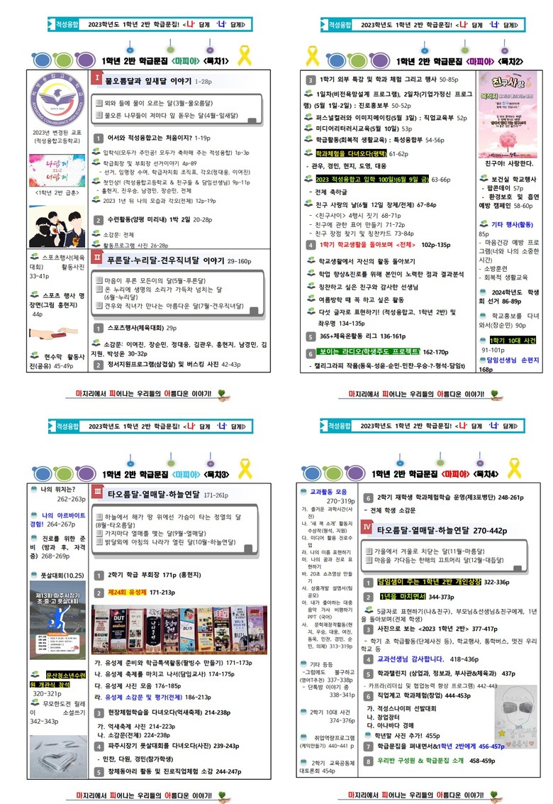 학급문집에는 정경선 선생님과 1학년 2반 학생들의 지난 1년 동안의 이야기가 고스란히 담겨 있다. 매월 학생들의 진로와 진학 프로그램, 학습활동 자료, 건강증진, 인성교육, 스포츠 행사, 학교 축제인 유성제, 아침먹기행사, 점심시간 팝콘데이, 버스킹, 텃밭 가꾸기 등 다양한 활동의 기록들을 고스란히 실었다.