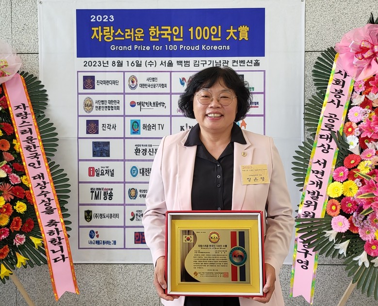 자랑스러운 한국인대상시상식조직위원회가 주최하는 ‘2023 자랑스러운 한국인 대상 시상식’은 정치ㆍ경제ㆍ사회ㆍ문화ㆍ예술ㆍ종교ㆍ스포츠 등 각 분야에서 묵묵히 헌신ㆍ노력해 온 숨은 공로자에게 수여하는 상으로 장은영 의원은 교육 및 지방자치 발전에 기여한 공로를 인정받아 수상했다.