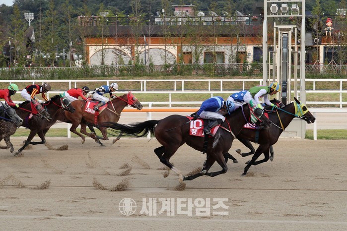 [세계타임즈 신동현기자]그야말로 손에 땀을 쥐는 접전! 5세 암말 인디언스타가 2년 연속 제주특별자치도지사배 우승의 대업을 달성했다. 인디언스타는 9월 3일(일) 렛츠런파크 서울에서 열린 제5회 제주특별자치도지사배(제9경주, 3세 이상 암말, 1400m)에서 목차로 브라이트스타를 따돌리며 가장 먼저 결승선을 통과했다. 지난해 10월에 이어 임성실 기수와 재차 호흡을 맞춰 승리를 차지한 것이라 기쁨도 클 수밖에 없었다.