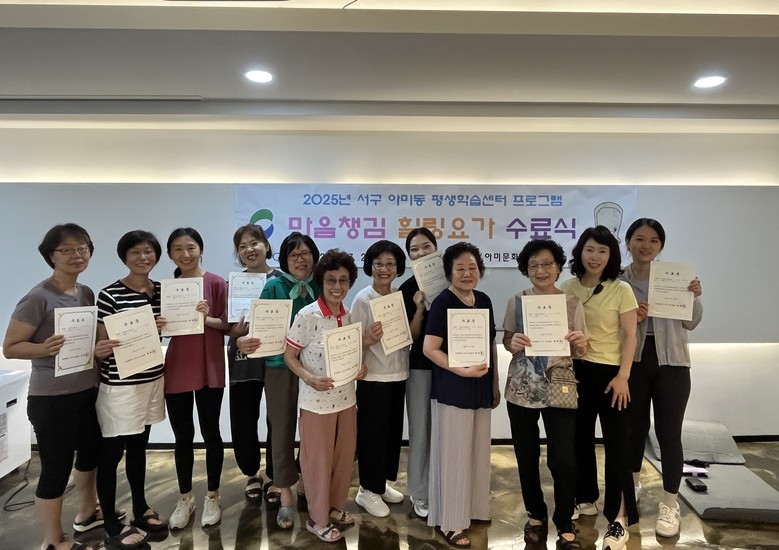 [서구 세계타임즈=이용우 기자] 부산 서구 아미동은 25일, 서구평생학습센터 프로그램 『마음챙김 힐링요가』 수료식을 아미문화학습관에서 개최하였다. 이번 프로그램은 지난 3월부터 7월까지 20주간 진행되었으며, 지역 주민들의 정신적 안정과 신체 건강 증진을 위해 마련됐다. 한 수강생은 “이번 프로그램을 통해 일상의 스트레스를 덜고 몸과 마음이 건강해지는 시간을 가져서 행복했다.”라며 소감을 전했다.