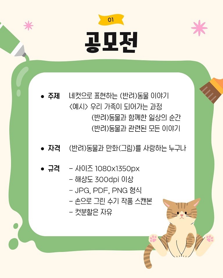 이번 공모전은 동물과 만화(그림)에 관심 있는 누구나 참여할 수 있으며, 반려동물과 일상에서 겪는 재미있고 따듯한 순간을 네컷만화로 표현하면 된다. 접수기간은 오는 10일부터 15일까지이며, 전자우편(pricdesign@naver.com)으로 접수한다.