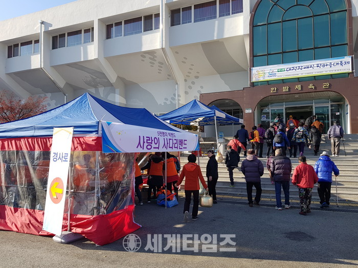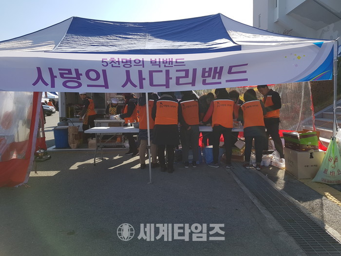 [대전=세계타임즈 이장성 기자] 다양한 봉사활동을 하고 있는 5천명 봉사단체 사랑의 사다리 밴드(리더 이정제)가 16일 오전 9시부터 (사)대전광역시지체장애인협회(회장 박태규)에서 주관한 “제14회 대전장애인한마음대축제”행사장인 한밭체육관에서 사랑의 즉석빵 천개와 교통봉사 및 개막식전 축하 공연으로 훈훈한 이웃사랑을 전달하였다.