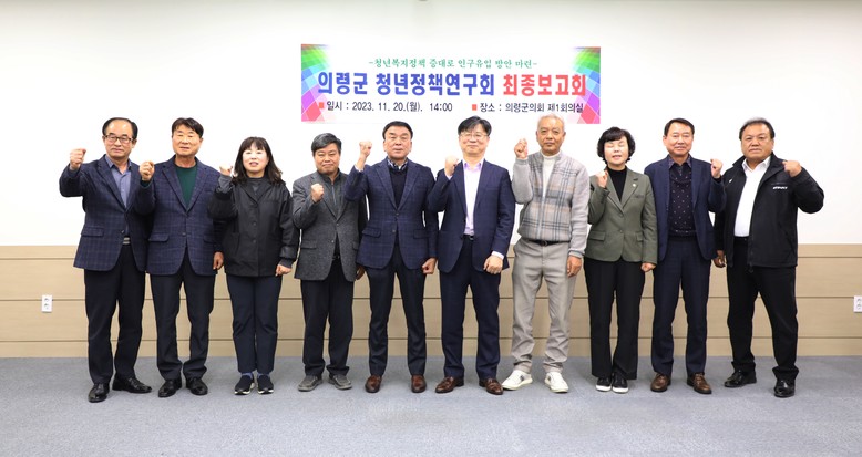 연구단체의 대표 의원인 주민돈 의원은 “이번 연구 활동을 통해 의령군 실정에 맞는 정책 대안을 마련하여 의령군 인구 감소와 청년 정책에 힘을 보태겠다”고 밝혔다.