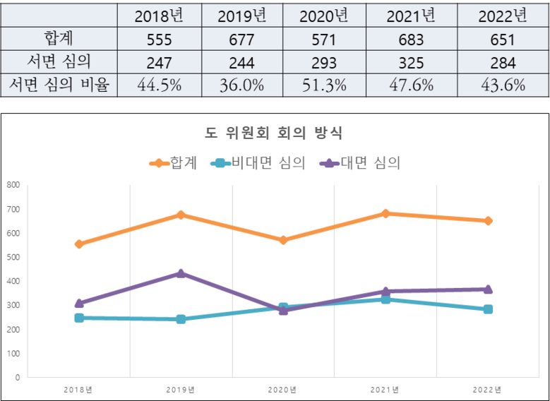 한 의원에 따르면, 지난해 총 230개 위원회가 개최한 651차례 회의 가운데 43.6%(284회)가 서면심의로 대체되었다. 코로나19 영향으로 비대면이 사회 주류 소통방식이었다고는 하나, 코로나19 이전인 2018년 서면심의 비율(44.5%)이 이보다 높아 서면심의가 관료주의.행정편의주의와 맞물려 일종의 관행이 된 것이 아니냐는 우려를 사고 있다.