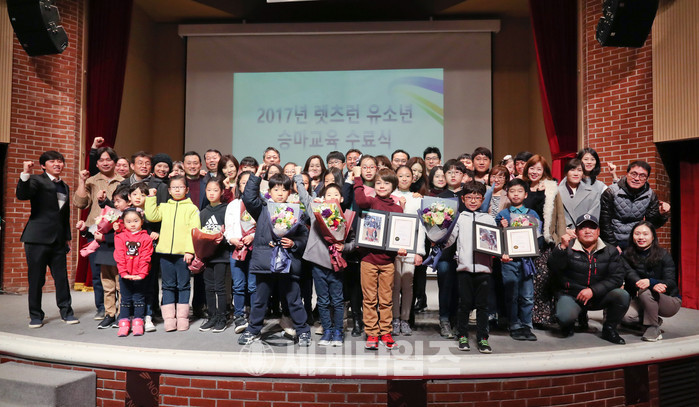 [세계타임즈 뱍채원기자]한국마사회(회장 이양호)가 10일(일) 렛츠런파크 서울 문화공감홀에서 ‘2017 렛츠런 유소년 승마단’ 수료식을 시행했다. ‘렛츠런 유소년 승마단’은 한국마사회가 유소년 승마인구 저변 확대와 미래 승마 수요 창출을 위하여 2010년 창단했으며, 올해로 8기 수료생을 배출했다.