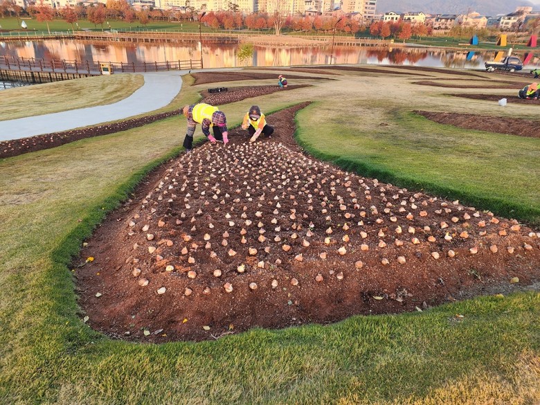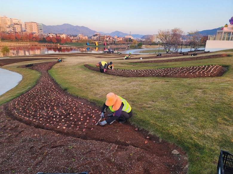 식재된 알뿌리는 튤립 16종 6만 본(아펠둔 등), 히아신스 4종 1만 본(블루스타 등)으로 구성되며, 특히 대표 경관지인 물방울정원과 홀릭정원에는 다채로운 색감을 연출할 수 있도록 품종을 조화롭게 배치했다. 이를 통해 내년 봄 한층 풍성하고 화려한 꽃경관이 펼쳐질 것으로 기대된다.