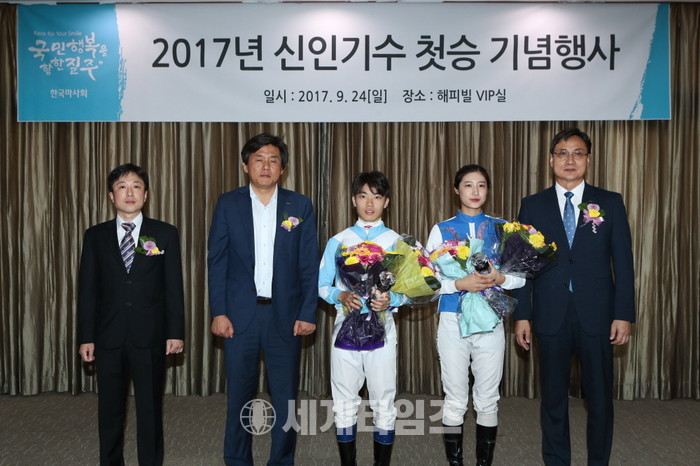 [세계타임즈 신민정 기자]24일(일) 한국마사회(회장 이양호)가 렛츠런파크 서울 신인기수들의 첫 승을 축하하는 기념행사를 했다. 지난 6월 2일 데뷔한 김효정, 이동진 기수는 첫 승 기념패와 꽃다발을 받으며 경마 기수로서의 성공적인 출발을 축하받았다. 함께 데뷔한 김덕현기수는 부상으로 참석하지 못했다.
