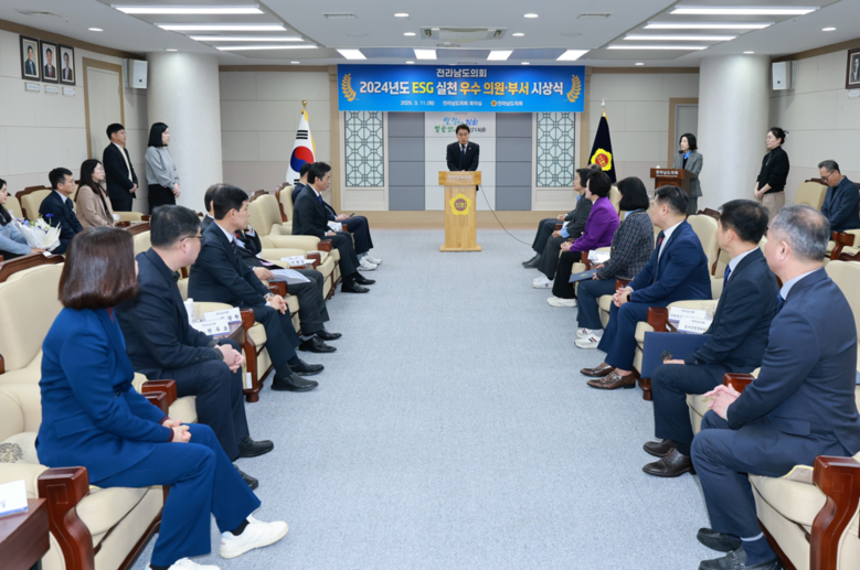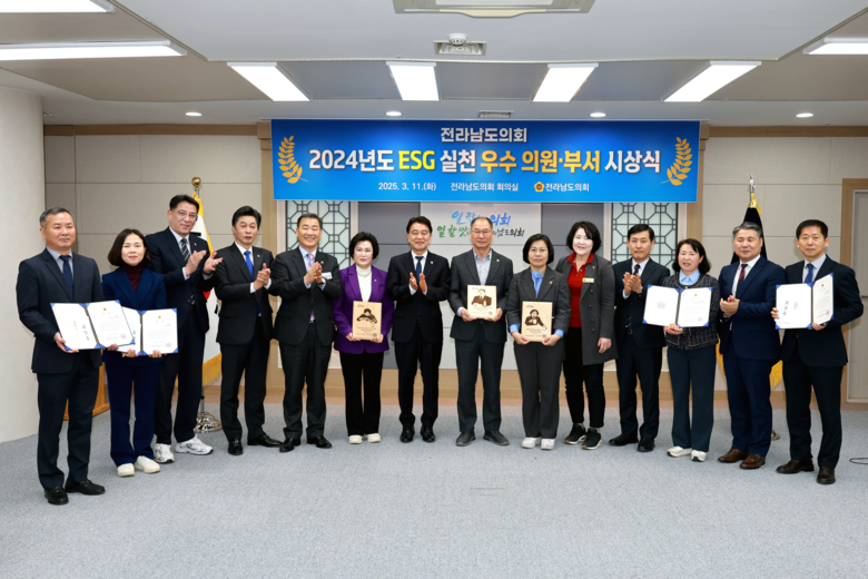 [전남 세계타임즈=우덕현 기자] 전라남도의회(의장 김태균)는 3월 11일 도의회 4층 회의실에서 2024년도 ESG 실천 우수 의원·부서 시상식을 개최하였다.
