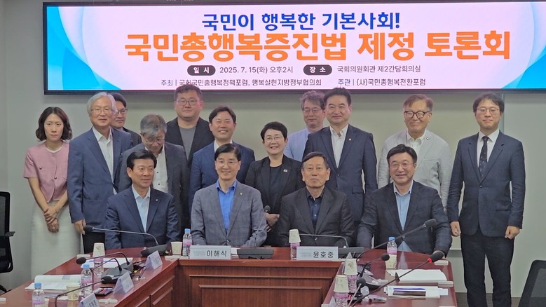 [세계타임즈 = 진정화 기자] 국민의 삶의 질과 행복을 국정 운영의 중심 가치로 삼기 위한 ‘국민총행복증진법’ 제정 논의를 위한 공개 토론회가 7월 15일 서울 여의도 국회의원회관에서 열렸다. 이날 토론회는 더불어민주당 윤호중 의원과 국민총행복정책포럼이 공동 주최했으며, 학계·정부·지자체 인사들이 대거 참여해 정책 방향을 공유하고 법제화 필요성을 강조했다.