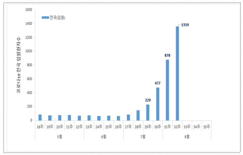 ◈ 전국 신규 입원환자는 8월 둘째 주 1359명으로 올해 최고치 기록, 6월 둘째 주 대비 21.9배 급증