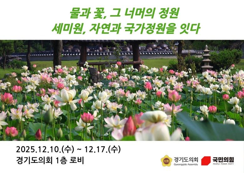 ○ 다양한 전시로 세미원과 두물머리 일원의 생태‧문화적 가치 널리 알릴 것! [경기도 세계타임즈=송민수 기자] 경기도의회 국민의힘(대표의원 백현종)이 경기도 지방정원 제1호인 양평 세미원의 국가정원 선정을 위한 기획전 ‘물과 꽃의 정원, 세미원’을 10일부터 17일까지 8일간 도의회 1층 로비에서 개최한다.