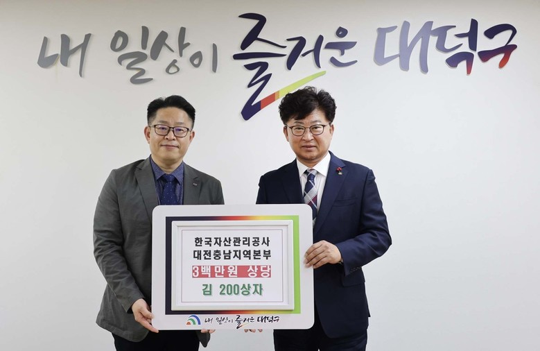 [대덕구 세계타임즈=이채봉 기자] 대전 대덕구(구청장 최충규)는 한국자산관리공사 대전충남지역본부(본부장 이강철)로부터 300만원 상당의 김 200상자를 기탁받았다고 밝혔다.