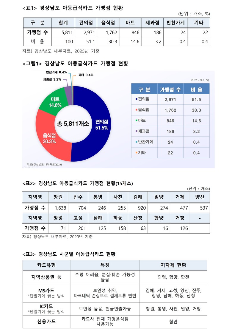 이어서 “도내 사정도 다르지 않다”며, “도내 아동급식카드 가맹점 중 편의점이 51.1%로 가장 많은 비중을 차지하며, 음식점은 30%에 그치고 있다”고 말했다. 또한 “지역별로 아동급식카드 유형도 각기 달라 주요정보 제공에서도 차이가 발생해 불편과 차별을 발생 시킨다” 며, “시군의 자율적인 운영에만 책임을 맡길 것이 아니라 지자체별로 발생하는 편차를 개선할 수 있도록 경상남도가 광역지자체 차원에서 신용카드를 전면 도입해야한다”고 촉구했다.