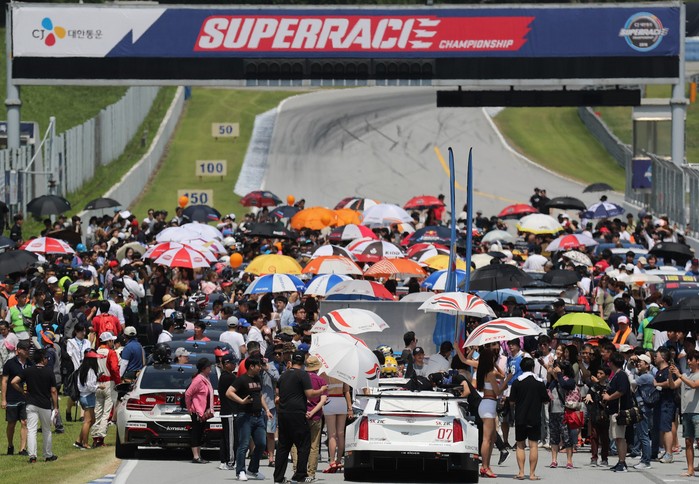 [사진설명] 에버랜드 스피드웨이에서 열린 2018 CJ대한통운 슈퍼레이스 챔피언십 4라운드 경기 당시 그리드워크 행사에 참가한 관람객들이 서킷을 가득 메우고 있다.