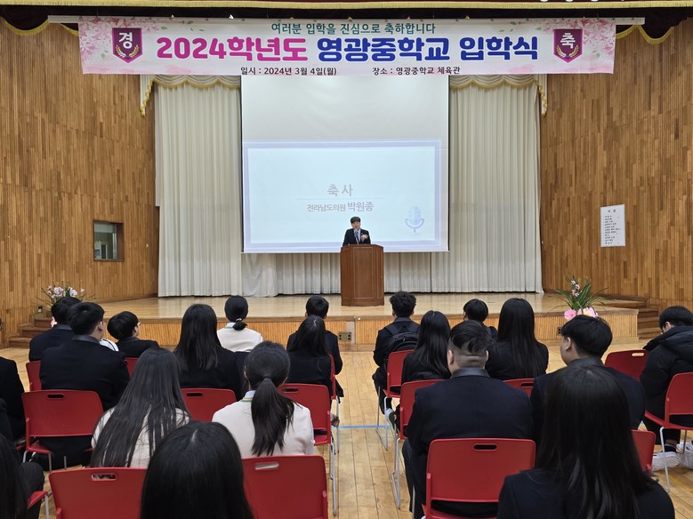 [전남 세계타임즈=우덕현 기자] 전라남도의회 기획행정위원회 박원종 의원(더불어민주당, 영광1)이 지난 3월 4일 모교인 영광군 소재 영광중학교 2024년 신입생 입학식에 참석하여 후배들에게 축하와 격려의 말을 전했다.