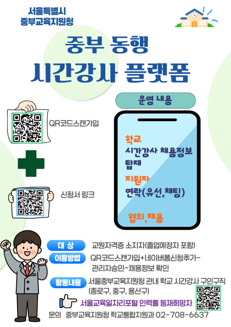 아울러 중부교육지원청은 시간강사 채용 지원을 위해 서울교육일자리포털을 활용한 시간강사 인력풀 등록을 지원하는 한편, 자체적으로 네이버 밴드를 통한 시간강사 인력풀(명칭: 중부동행시간강사 플랫폼)를 운영하여 학교와 시간강사를 보다 신속하게 연결할 계획이다. 이를 통해 학교에서는 적합한 시간강사를 신속하게 찾을 수 있고, 교원 자격증 소지자 및 퇴직교원에게는 교육현장 참여기회를 확대하는 효과를 거둘 것으로 기대된다.