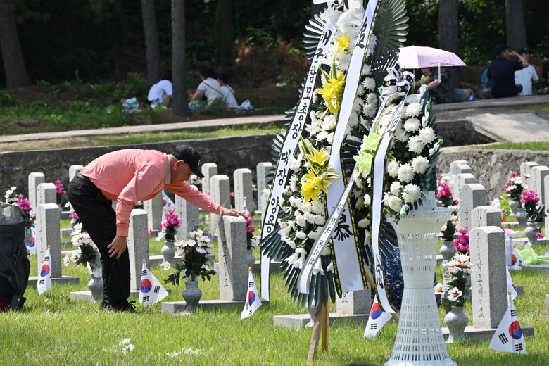 | ▲ 지난 6일 오전 서울 동작구 국립서울현충원에서 제70회 현충일 추념식이 거행된 가운데 한 참배객이 애국지사가 안장된 묘석을 어루만지고 있다. [사진 제공 = 신천지 바돌로매지파] |
