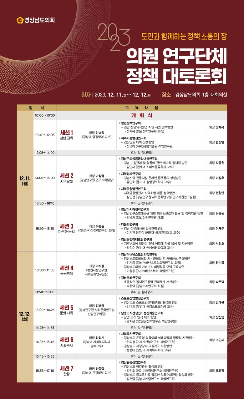 - 12. 11.~ 12. 양일간 분야별 7개의 세션 토론회로 진행 [경남 세계타임즈=최성룡 기자] 경상남도의회(의장 김진부)는 의회의 입법 및 정책 역량을 강화하고 도민과의 정책 소통을 강화하기 위해 오는 12월 11일부터 12일까지 양일간 「2023 의원 연구단체 정책 대토론회」를 개최한다.