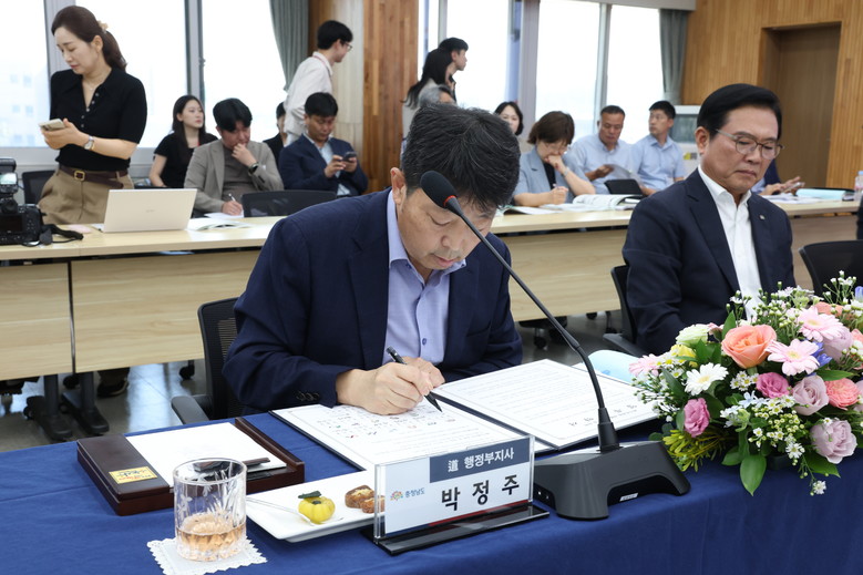 도는 27일 논산시청 대회의실에서 열린 ‘2025년 제4회 도·시군 정책현안 조정회의’에서 박정주 행정부지사와 정덕기 이(E)-순환거버넌스 대표, 시군 부단체장 등이 ‘중·소형 폐가전제품 재활용 촉진 업무 협약’을 체결했다고 밝혔다.